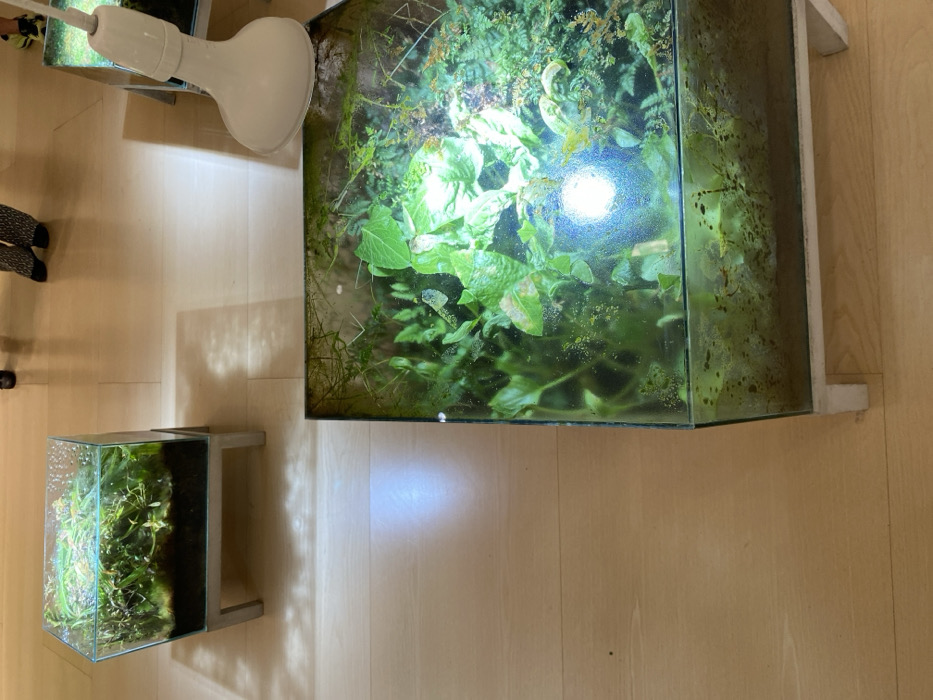 The image displays an indoor exhibition space, identified as the Guggenheim Museum Bilbao, characterized by its light-colored polished wooden floor. The primary subjects are two prominent glass aquariums or terrariums containing dense green plant life, soil, and water. In the foreground, a large, rectangular glass enclosure rests on small, light-colored feet directly on the floor. Its interior features abundant green foliage, some submerged and some possibly emergent, over a dark substrate. A bright white, downward-facing lamp is suspended directly above the front-right corner of this enclosure, casting a strong, circular reflection on the glass surface. The glass exhibits visible water marks, mineral deposits, or residue. Behind and to the left of the foreground enclosure, a smaller, square glass aquarium is elevated on a light-colored, four-legged stand. This enclosure also contains dense green aquatic vegetation over a dark layer of soil. In the blurred background, the lower legs and feet of at least two individuals are partially visible. One individual wears dark trousers with a light pattern and dark shoes, while another wears light-colored athletic shoes and what appears to be light-colored shorts. A third, partially obscured aquarium with a similar overhead light fixture is visible in the far-right background. The wooden floor reflects light from the installations and shows various shadows, including distinct patterns cast by the elevated aquarium's stand. No direct interactions between people and the installations are evident beyond their presence in the exhibition space.