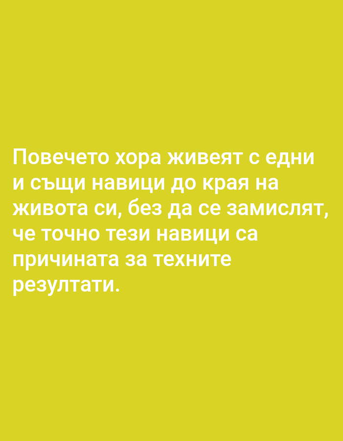 The image consists solely of white Bulgarian text superimposed on a plain, solid yellow background. The text, presented in a sans-serif typeface, occupies the central portion of the image. It reads: "Повечето хора живеят с едни и същи навици до края на живота си, без да се замислят, че точно тези навици са причината за техните резултати." This translates to: "Most people live with the same habits until the end of their lives, without realizing that exactly these habits are the reason for their results." No people, subjects, objects, or actions are depicted in the image. The environment is entirely graphical. There are no visual elements present in the image that indicate a specific geographical location, including the city of Shumen, Bulgaria.