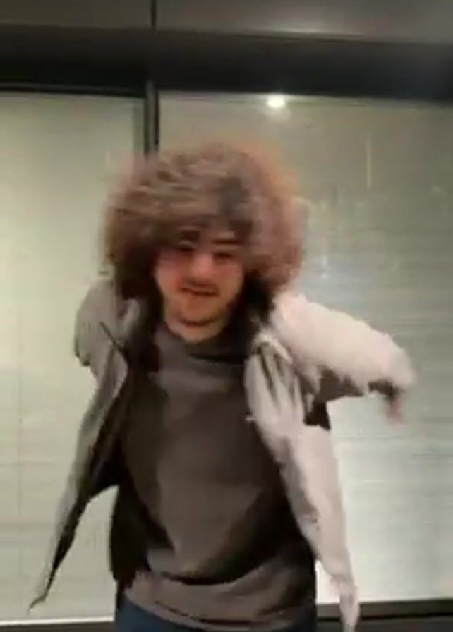 A man with curly hair is seen from the back, dancing in front of a large window. He is wearing a gray jacket, a dark t-shirt, and blue jeans. The window is made up of several panes and has closed blinds visible through the glass. The man’s movements involve swinging his arms and rotating his body.