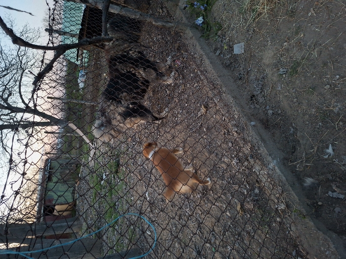 This image captures an outdoor scene, likely a rural or semi-rural enclosure, in Moshtanets, Bulgaria, at dusk. The foreground is dominated by a weathered chain-link fence, topped with barbed wire, and a concrete curb at its base. A smaller, light brown dog with a white collar stands behind the fence, facing away from the viewer and looking towards the right. On the other side of the fence, a larger, shaggy-coated dog, predominantly dark brown and black with tan markings, stands with its back partially to the viewer, facing right. The ground on both sides of the fence consists of dry, barren earth with scattered debris, including feathers and small pieces of trash. In the background, several bare trees are visible against a twilight sky showing faint orange and blue hues. A dilapidated, green-painted wooden shed with visible interior is located behind the fence on the left. A blue rope or hose hangs vertically on the left, draped over the fence.