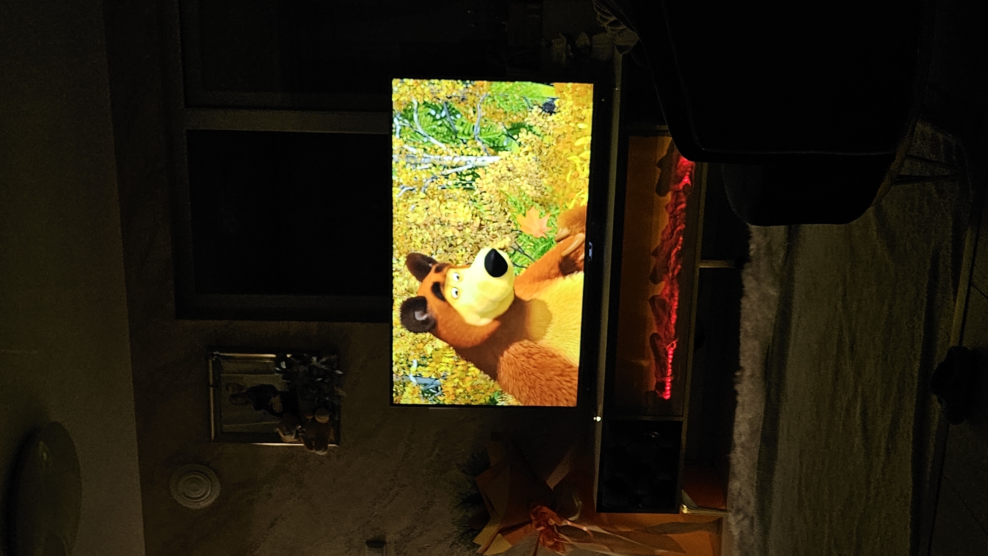 The image depicts an interior scene, likely a living room, in Iasenovets, Bulgaria, characterized by low lighting conditions suggesting evening or nighttime. A flat-screen television, positioned centrally, displays a frame from the animated series "Masha and the Bear," featuring the brown bear character with a surprised expression against an autumn forest background with yellow and green foliage. The television rests on a dark entertainment unit, which incorporates an electric fireplace with a simulated red glow of burning logs in its lower section. To the left of the television, a large, vertically oriented object wrapped in orange or yellow paper with ribbons, possibly a gift or bouquet, stands on the floor. Above this object, a framed picture hangs on a textured, light-colored wall, depicting two indistinct figures. A circular, white wall ornament is visible further to the left of the picture. To the right of the television, a dark-colored armchair is partially visible. The floor is covered with a dark carpet, with a lighter, possibly shaggy, rug segment in front of the entertainment unit. A dark, rectangular shape, likely a window or door, is visible in the upper right background. A ceiling light fixture is dimly visible at the top center. No individuals are present in the observable scene.