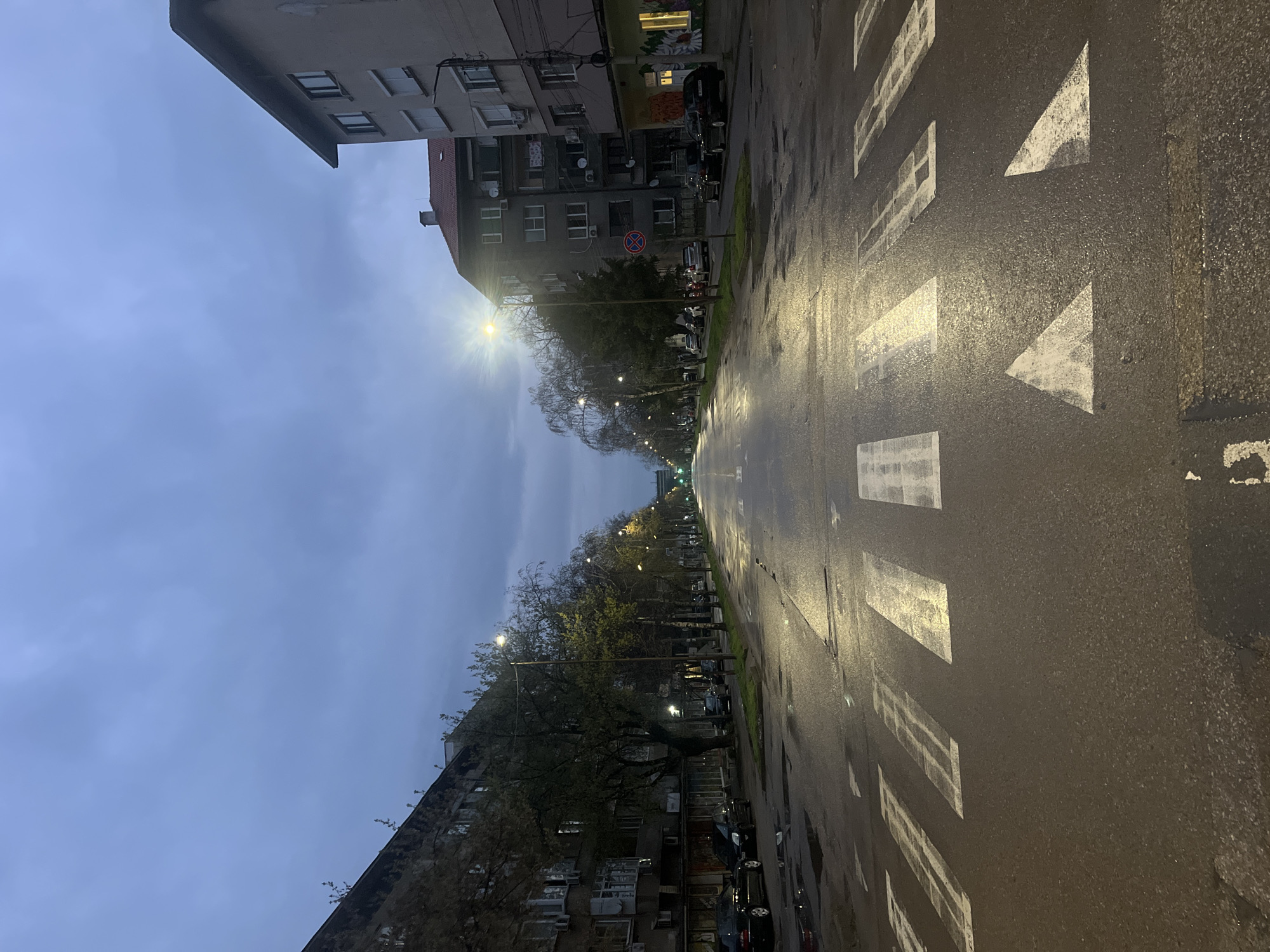 The image depicts an urban scene in Montana, Bulgaria, at dusk or dawn. A wet asphalt street stretches into the distance, marked with a pedestrian crossing indicated by white triangle markings. On either side of the street, rows of multi-story apartment buildings line the road, with trees planted along the sidewalks. Streetlights illuminate the scene, reflecting off the wet road surface. Vehicles are parked along the sides of the street. The sky is overcast with grey clouds.