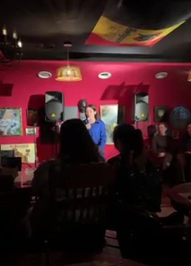 woman giving a standup comedy performance at a small club
