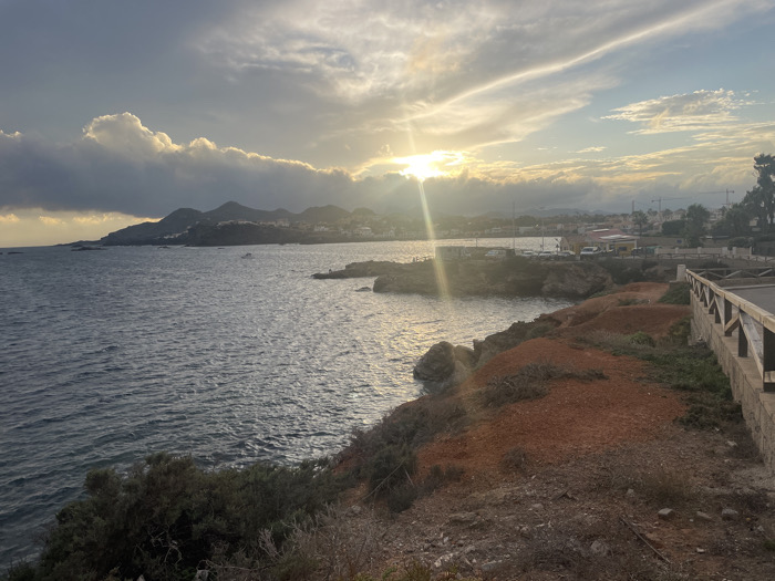 The image presents a coastal landscape near Cartagena, Spain, during either sunrise or sunset, characterized by dramatic lighting