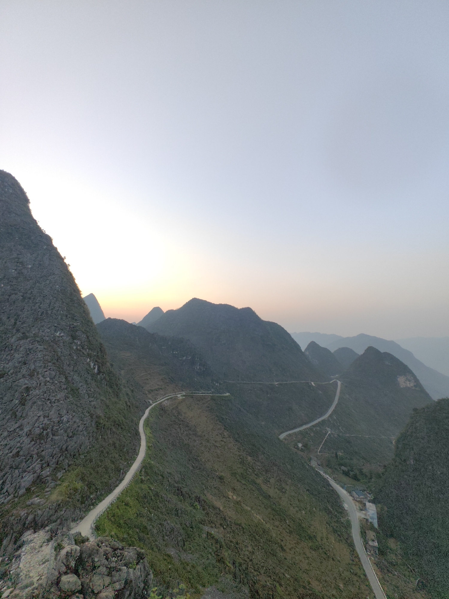 mountain landscape in Đồng Văn Commune, Vietnam, likely at dusk or dawn, indicated by the diffused light on the horizon