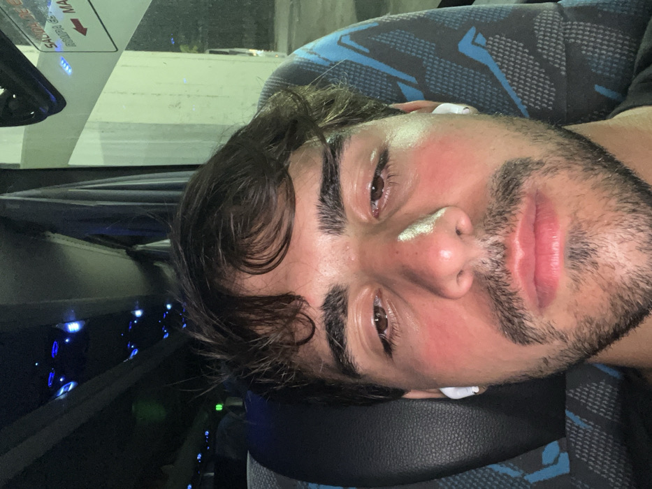 A man with brown hair, stubble, and flushed skin rests on a patterned bus seat. He wears wireless earbuds. The interior of the bus is visible, with a window showing a white structure outside and illuminated blue lights within the vehicle. The image is rotated, giving a tilted perspective of the man's face and surroundings.