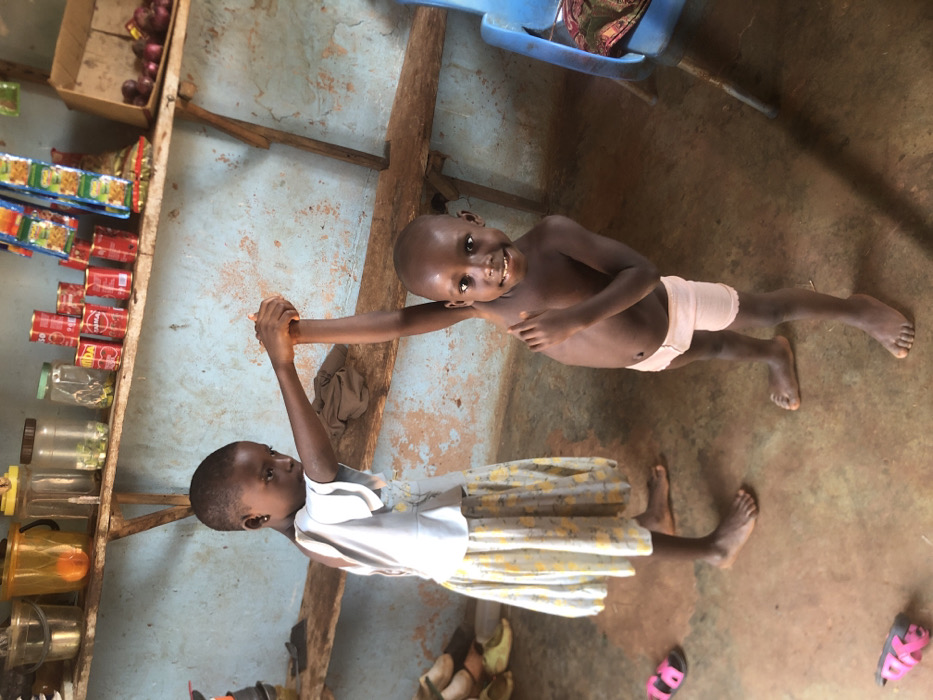 The scene depicts two children inside a room, likely a small general store or dwelling, in Ukwu-Abwa, Nigeria
