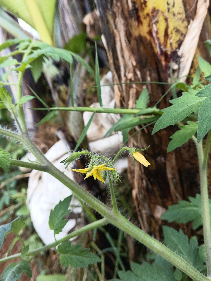 A close-up showcases tomato plants with distinctive fuzzy stems and green leaves. Two small, yellow, star-shaped tomato blossoms are prominently displayed. The background is a mix of textures, with a thick, rough tree trunk or plant stem, tinged with brown and yellow hues. A white object, possibly plastic or fabric, adds a lighter element to the scene.