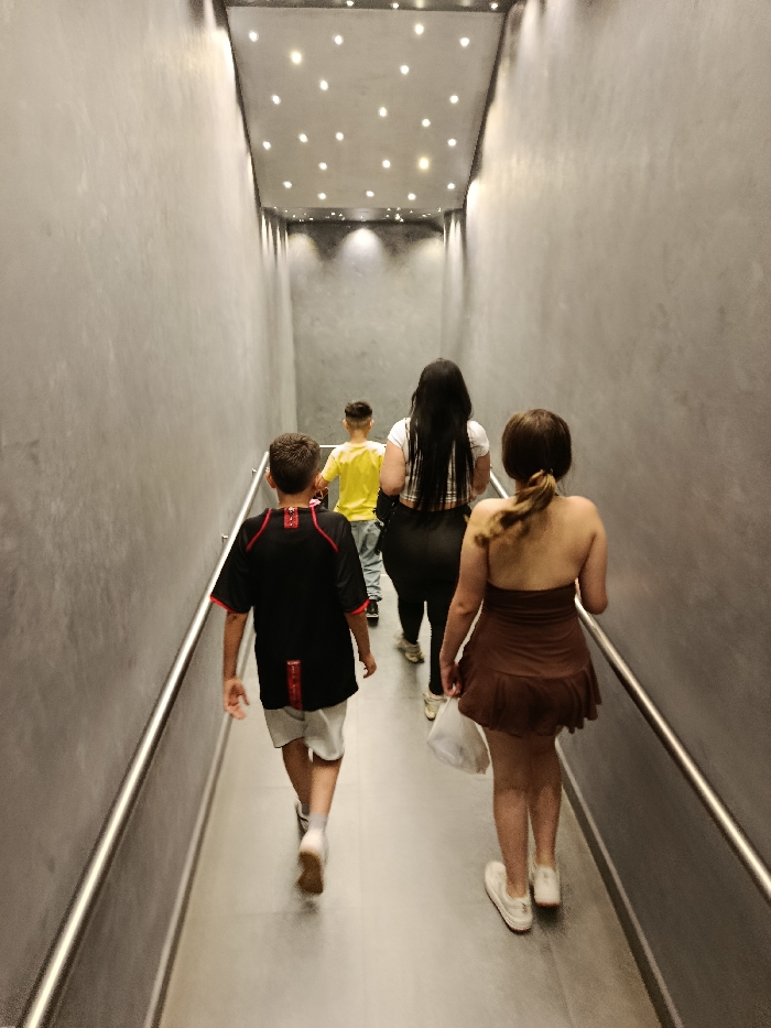 A group of four people walk away from the viewer down a long, narrow hallway. The walls are a textured gray, and a silver handrail runs along each side. The ceiling is low and has a pattern of small, circular lights. A young boy is wearing a black and red soccer jersey, another is in yellow, and two women are wearing casual dresses. Their backs are to the camera.