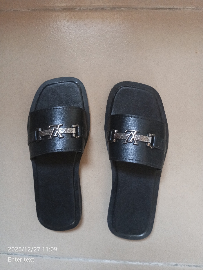 - "A pair of black slip-on sandals is centrally displayed on a light brown tiled floor" by FM-MfXPv1, licensed under CC BY 4.0