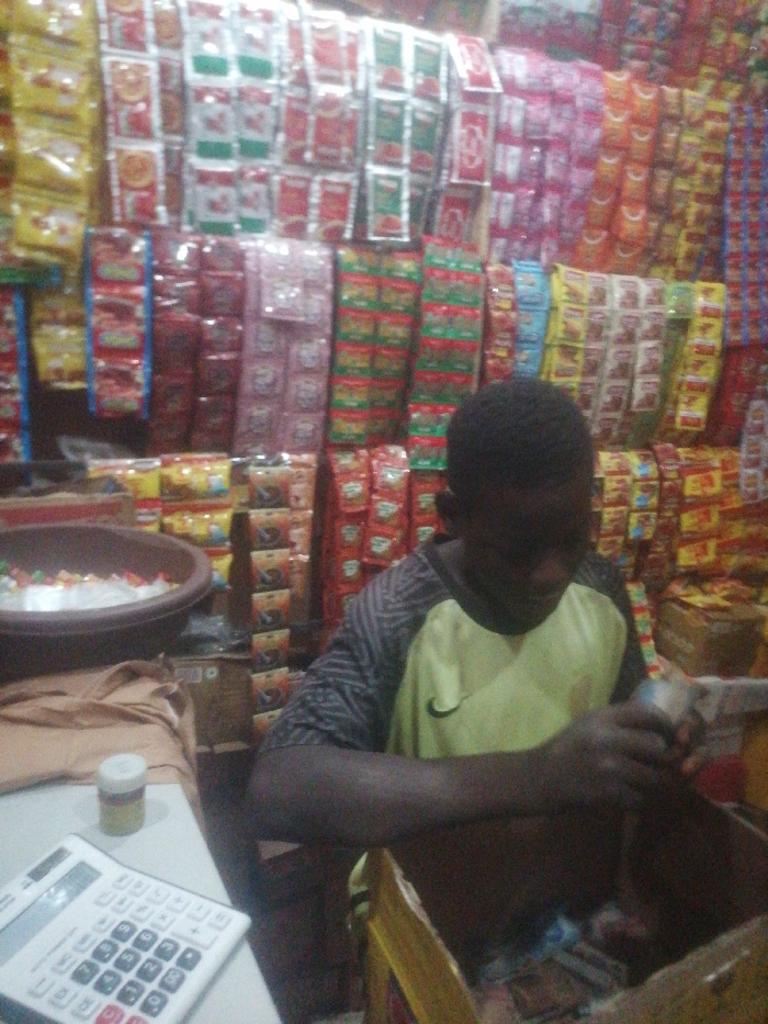 A young person wearing a grey-and-yellow shirt stands behind a counter in a small shop. A calculator and a small jar sit on the counter beside a bowl full of candy. The person is reaching into a box, possibly handling money. Behind them, the walls are covered with rows of small, colorful packets of various products. The overall scene is somewhat cluttered and densely packed with goods.