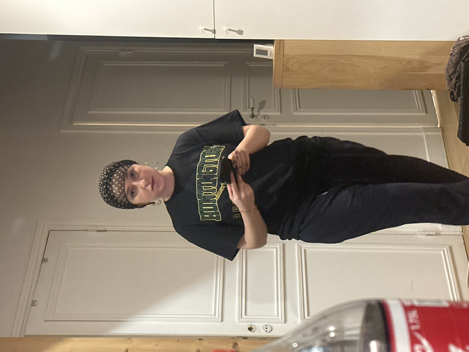 The image depicts an indoor scene in Puteaux, France, featuring a young adult female standing centrally, facing slightly right of the camera. She wears a black, sheer, polka-dotted headscarf, large silver-colored hoop earrings, a black short-sleeved t-shirt with "HUNTINGTON" in green lettering outlined in yellow, and dark sweatpants. Both hands hold a black smartphone horizontally, with thumbs positioned for interaction. Her expression is neutral with her mouth slightly open. In the immediate foreground, left, a partially visible red and white 1.75L Coca-Cola bottle stands. The background consists of two white paneled doors with dark hardware. Between the right door and a white vertical cabinet-like surface, a light-colored wooden cabinet is visible, topped by a small white rectangular electronic device with a dark screen. A pile of dark-colored fabric or clothing lies on the floor in the bottom right corner.