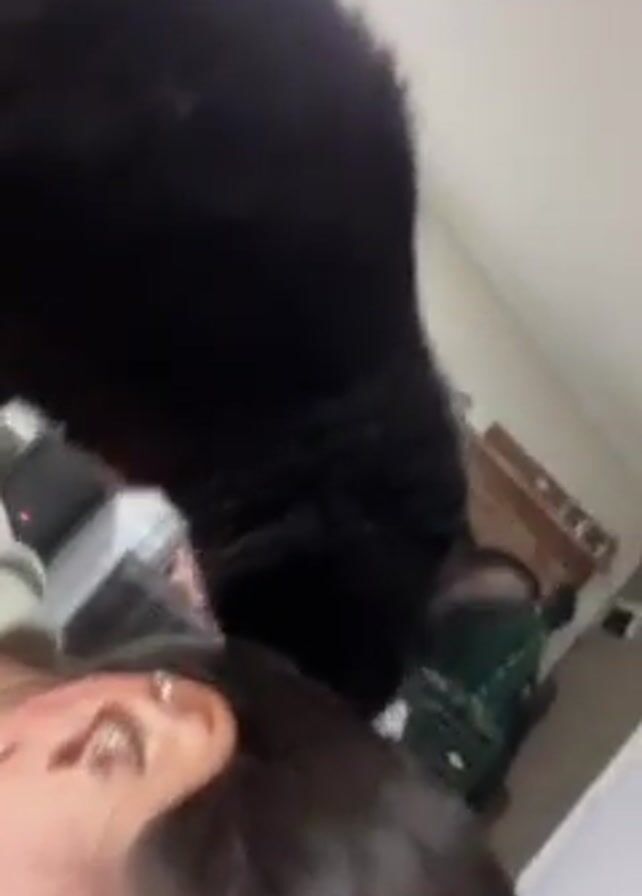 A black cat is standing on a person's torso. The camera angle is low and close to the person, focusing on their face and the cat. The person is lying down and looking slightly up at the cat. The cat sniffs at the person's hair and face. The background is blurred and appears to be a room with white walls and a light fixture.