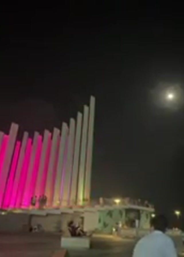 At night, a brightly lit architectural structure stands near a beach under a full moon. The structure is adorned with vertical white columns illuminated with pink and purple light. People are gathered on a viewing platform within the structure. A few individuals are walking on the paved area in front of it, and some are seated. The sea, visible in the foreground, has waves gently lapping the shore. The sky is dark, with the full moon shining through the clouds. In the lower right corner, a person is visible walking toward the camera. The building on the left side is partially lit with blue lights.