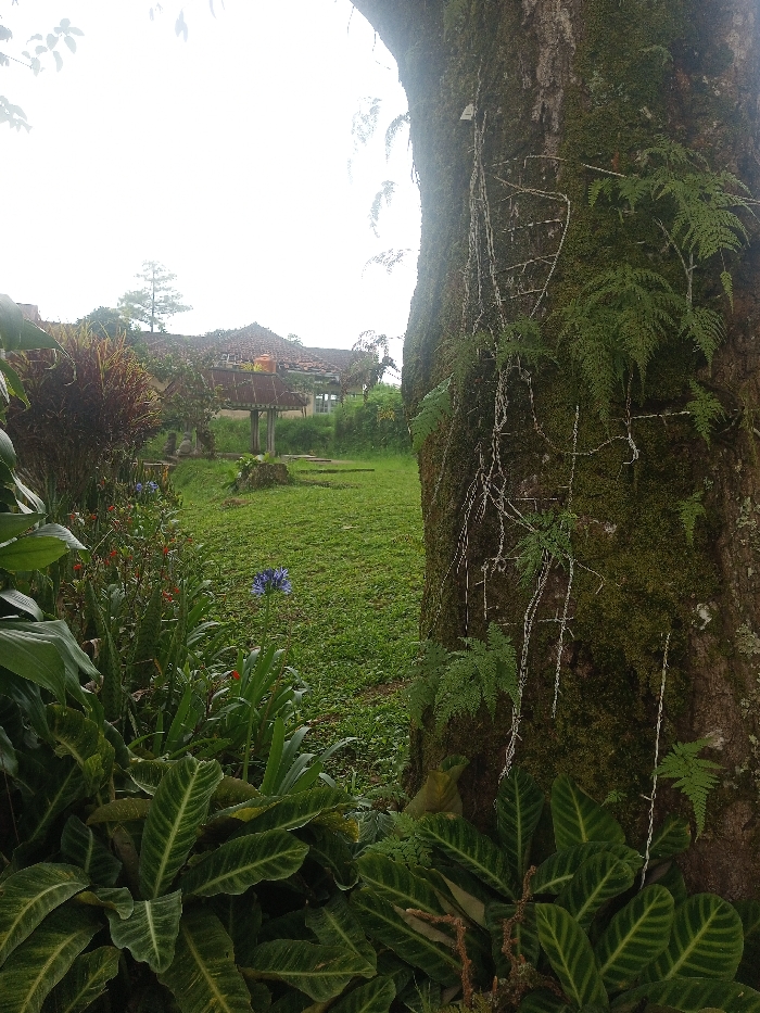 The image depicts a lush, verdant scene in Ciherang, Indonesia. In the foreground, a large, moss-covered tree trunk occupies the right side, adorned with ferns and delicate white epiphytic roots or vines. The lower left foreground features dense tropical foliage, including prominent plants with broad, striped green and light green leaves, interspersed with smaller plants displaying red berries or flowers. A single blue Agapanthus flower stands centrally in the mid-ground, rising above the low-lying flora. Beyond the immediate vegetation, a manicured green lawn extends towards the background. On the left side of the mid-ground, a small, open-sided structure with a weathered, corrugated metal roof is visible. Further back, a building with a distinctive red-tiled roof and visible windows is situated, and an orange water tank is present on its roof. A slender, coniferous tree is silhouetted against an overcast, bright white sky in the far background. No individuals or active interactions are observed. The environment suggests a well-maintained tropical garden or rural residential area under a bright, diffused light.
