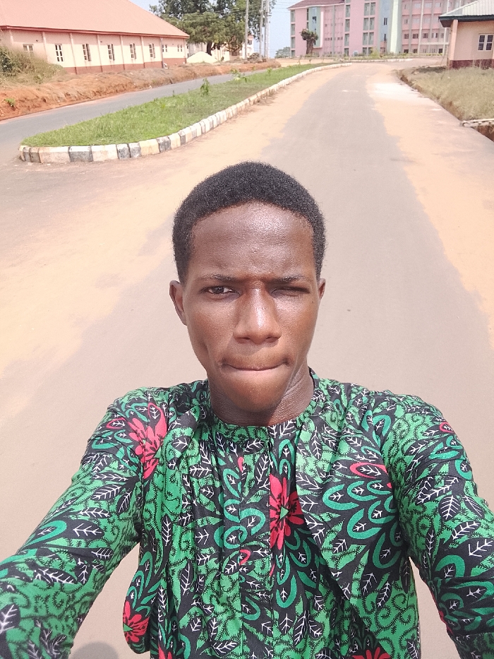 A young adult Black male is positioned centrally in a self-portrait, looking directly at the camera. He has short, dark, textured hair. His left eye is partially closed, and his lips are slightly pursed. He wears a long-sleeved garment featuring a green, black, and red pattern resembling foliage and floral elements. The scene is outdoors under bright daylight. Behind the individual, a wide, light brown unpaved or dusty paved road curves to the viewer's left. A narrow, raised grassy median with alternating light and dark curb stones separates the road. To the left of the road, a light beige building with a reddish-brown roof and multiple rectangular windows is visible behind a reddish-brown elevated dirt embankment. Further in the background on the right, a multi-story building, predominantly pink with darker vertical accents and numerous windows, is present. Trees are visible in the distant background. The environment is consistent with a university campus in Awkuzu, Nigeria.