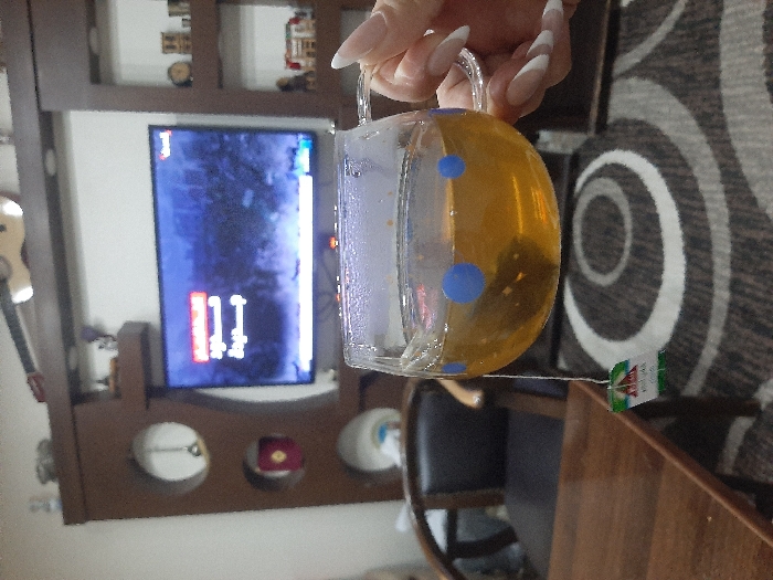 A hand holds a glass mug filled with tea, decorated with blue polka dots. A tea bag string extends from the mug to a wooden table. In the background, a television screen displays a blurred image, mounted within a wooden cabinet featuring decorative circular openings. A patterned gray and white rug partially fills the upper right. A chair with a black frame is also visible.