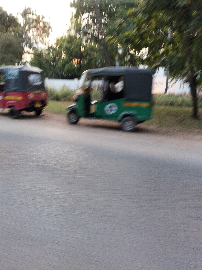 The image depicts a street scene in Gombato Bongwe ward, Kenya. Two auto-rickshaws are positioned on the right side of a grey asphalt road, which occupies the lower half of the frame. In the midground, a green and yellow auto-rickshaw with a black canopy is visible, facing left, featuring a circular white emblem on its side. A blurred human figure is discernible inside its cab. Behind and to the left of the green vehicle, a red auto-rickshaw with a black canopy is partially visible, oriented with its rear towards the viewer. Both vehicles exhibit motion blur. Beyond the road, a grassy verge leads to a light-colored wall or fence, with dense green trees forming the background under ambient daylight conditions.