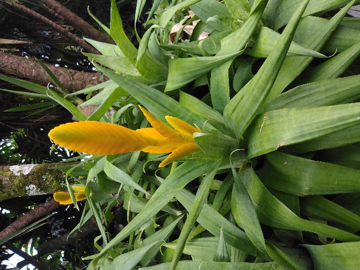 The image displays a close-up view of a flowering plant identified as a Bromeliad, situated in the city of Altamira, Mexico. The central subject is a prominent, erect, bright yellow inflorescence, characterized by imbricated (overlapping) bracts, emerging from the center of a dense rosette of broad, strap-like, dark green leaves. A second, smaller yellow inflorescence is partially visible in the mid-ground to the left. The background consists of dense, tropical foliage, including multiple tree trunks exhibiting textured, likely moss-covered bark, and various other green leaves. Natural light illuminates the scene, highlighting the plant's structure and color against the darker, somewhat blurred botanical environment. No individuals or animals are present, and no discernible actions or interactions are depicted within the frame.