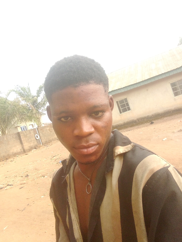 The image depicts a young adult male, likely in his early twenties, standing outdoors in Akwanga, Nigeria