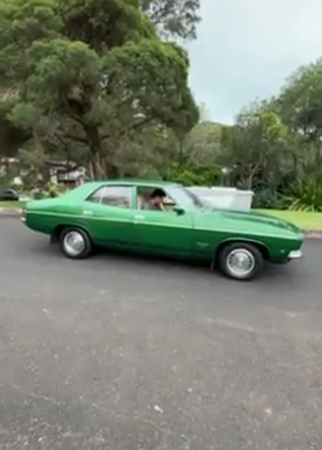 green vintage car, with a man in the driver's seat, on a paved road. The car is parked, facing to the right of the frame. The man is looking out the driver's side window and speaking to someone out of frame. There are trees on either side of the road, and a light gray sky in the background.