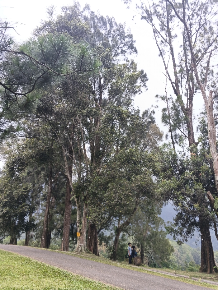A paved road cuts through a park-like landscape, bordered by green grass on one side and tall trees on the other. A small group of people stands near the road, partially obscured by the trees. The trees are varied, some with dense leafy canopies and others with sparse, needle-like foliage. The sky is overcast and a mountain or hillside can be seen faintly in the background.