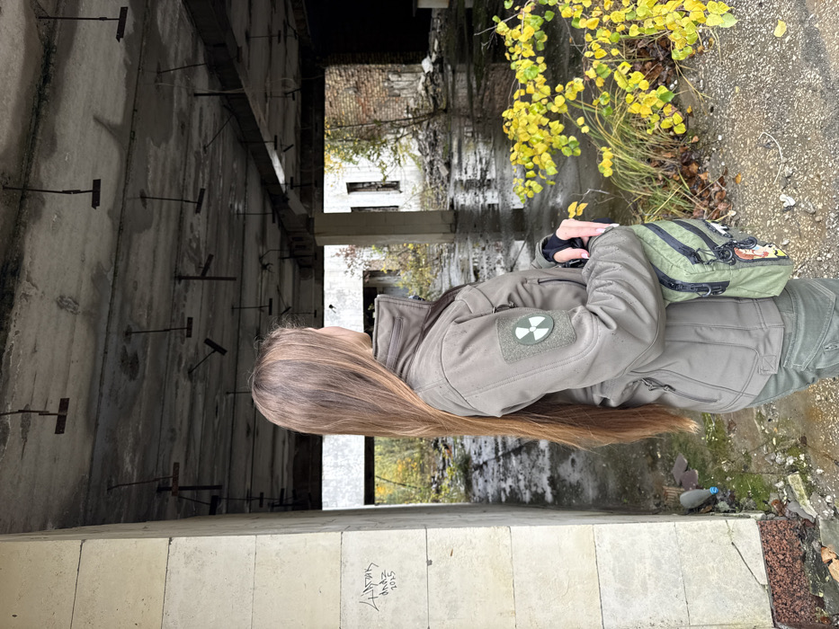 A female individual stands facing left, in profile, within an abandoned concrete building in Prypiat, Ukraine. She has long, straight, light brown hair. She wears an olive green tactical-style jacket with a radiation symbol patch on the right sleeve, matching olive green tactical pants, and a black fingerless glove on her right hand. She carries a small olive green tactical bag adorned with patches. The environment is an decaying concrete structure, with a prominent light-colored pillar on the left foreground bearing dark graffiti, including the word "ПРИПЯТЬ" and "2023." The concrete ceiling above exhibits numerous rusted metal rods or anchors hanging downwards. The ground is wet and uneven, showing reflections of light. In the background, other dilapidated brick and concrete buildings are visible through structural openings. Yellow-leafed foliage from a bush or small tree is prominent in the mid-right foreground, indicating an autumn season. The scene is characterized by advanced decay and natural overgrowth.