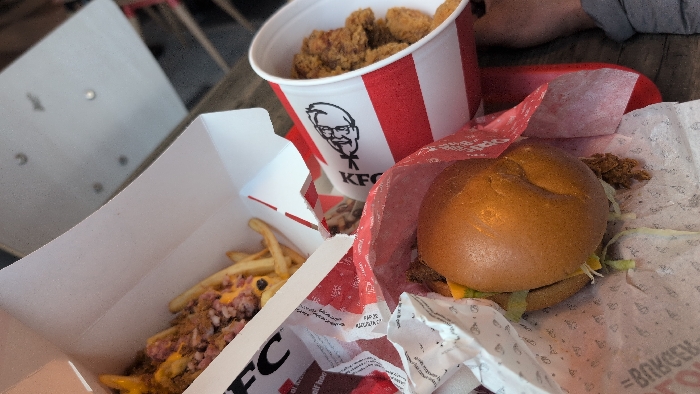 - "The image displays a close-up, slightly angled overhead view of a fast-food meal from Kentucky Fried Chicken (KFC) on a wooden-grain table" by FM-uRvbP2, licensed under CC BY 4.0