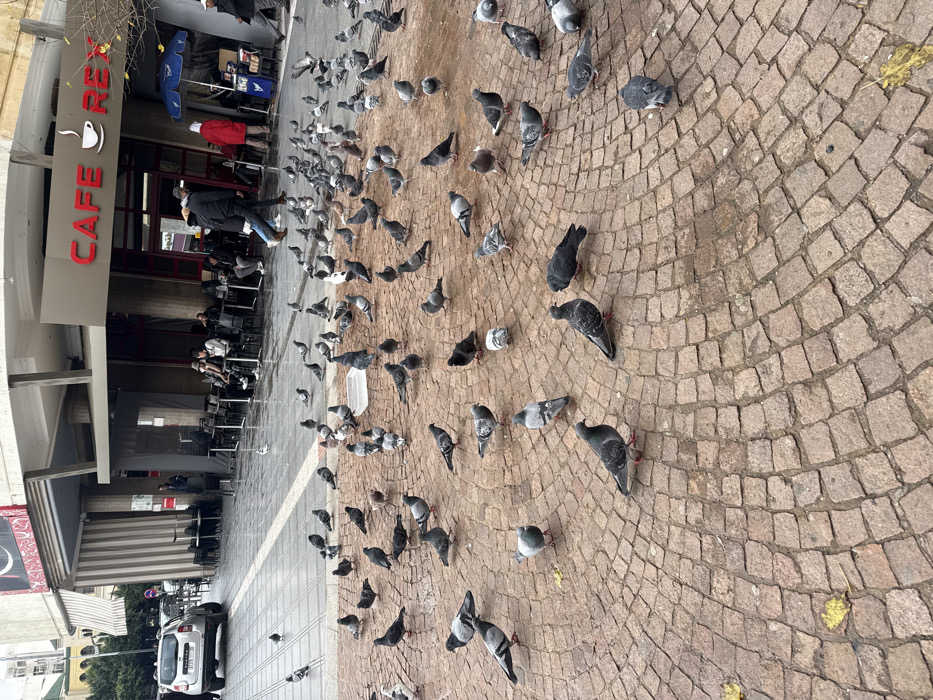 The image depicts an outdoor urban scene in Meknes, Morocco, specifically in a public area fronting "CAFE REX." The foreground is covered by a reddish-brown cobblestone pavement arranged in a semi-circular pattern, visibly damp in areas, with scattered yellow leaves. Over 80 rock pigeons, displaying varying shades of gray, black, and white plumage, are dispersed across this pavement; most are stationary, some appear to be pecking at the ground. A small, white, rectangular container is present among the pigeons in the mid-ground. In the background, a modern building houses "CAFE REX," identified by its prominent red signage featuring a white coffee cup icon. Dark-colored tables and chairs are arranged for outdoor seating on a smoother, lighter-toned paved area directly in front of the café. Several individuals are seated at these tables. A man in a dark coat and blue jeans is captured in mid-stride, walking from left to right across the paved area in front of the café. To the right of the café entrance, a person in a red hooded garment stands near a blue umbrella stall. Further to the right, another person walks away from the frame. On the far left, a silver Dacia Duster SUV is parked next to the curb on a paved street. The scene is illuminated under an overcast sky.