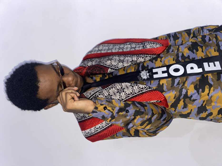 A man wearing sunglasses is seen sideways against a plain background. He wears a colorful, patterned shirt with decorative trim along the collar and sleeves. A black strap with the word "HOPE" in white lettering runs across his chest. He has short, dark hair and is holding his hand up to his face, seemingly in thought.