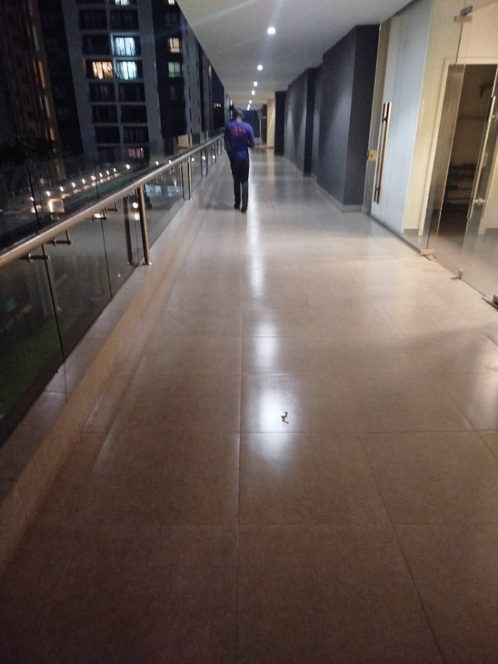 The image depicts an illuminated modern elevated walkway at night, located in Nairobi, Kenya. A single individual, dressed in dark trousers and a blue long-sleeved shirt with a red emblem on the back, walks away from the camera towards the distant end of the corridor. The walkway floor consists of large, light-colored square tiles, reflecting light from the recessed ceiling fixtures. To the left, a railing composed of a metal handrail and glass panels borders the walkway. Beyond this railing, a dark exterior area is visible, with hints of green vegetation immediately below. Further in the distance, a multi-story building with numerous illuminated windows is prominent. Small circular ground lights are visible along the edge beneath the railing. To the right, the wall features alternating dark gray and light-colored vertical panels. A glass door with a metallic vertical handle is located towards the far end on this side. The ceiling is flat, light-colored, and equipped with evenly spaced recessed lighting.