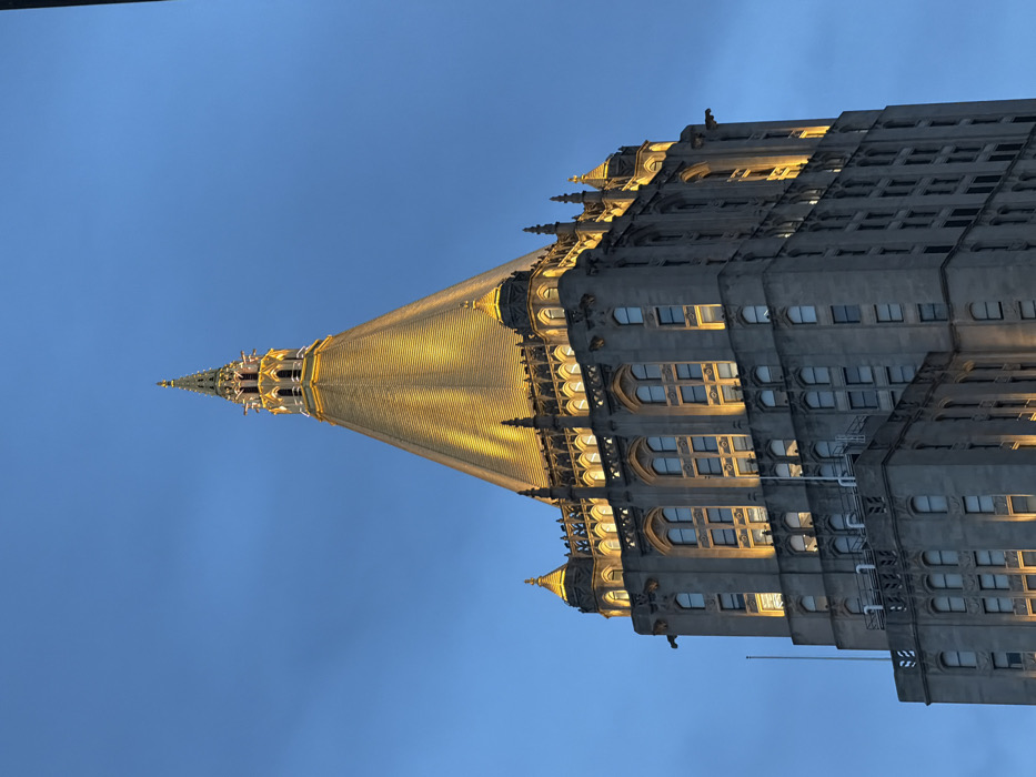 A tall, slender building towers against a blue sky. Its roof is pyramidal and golden, bathed in sunlight. Below the roof, the building's facade is grey and intricately designed with arched windows and decorative elements. The lower part of the building features rows of rectangular windows, reflecting a more modern architectural style. The angle of the shot emphasizes the building's height.