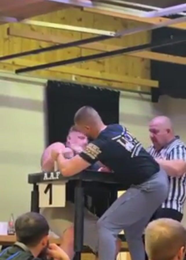 Two muscular men are engaged in an arm-wrestling match at a table marked "1"