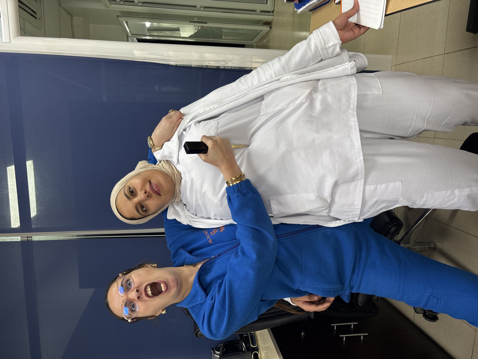 The scene is set indoors, likely within an office or staff area of Clinique Aliyat in Meknes, Morocco