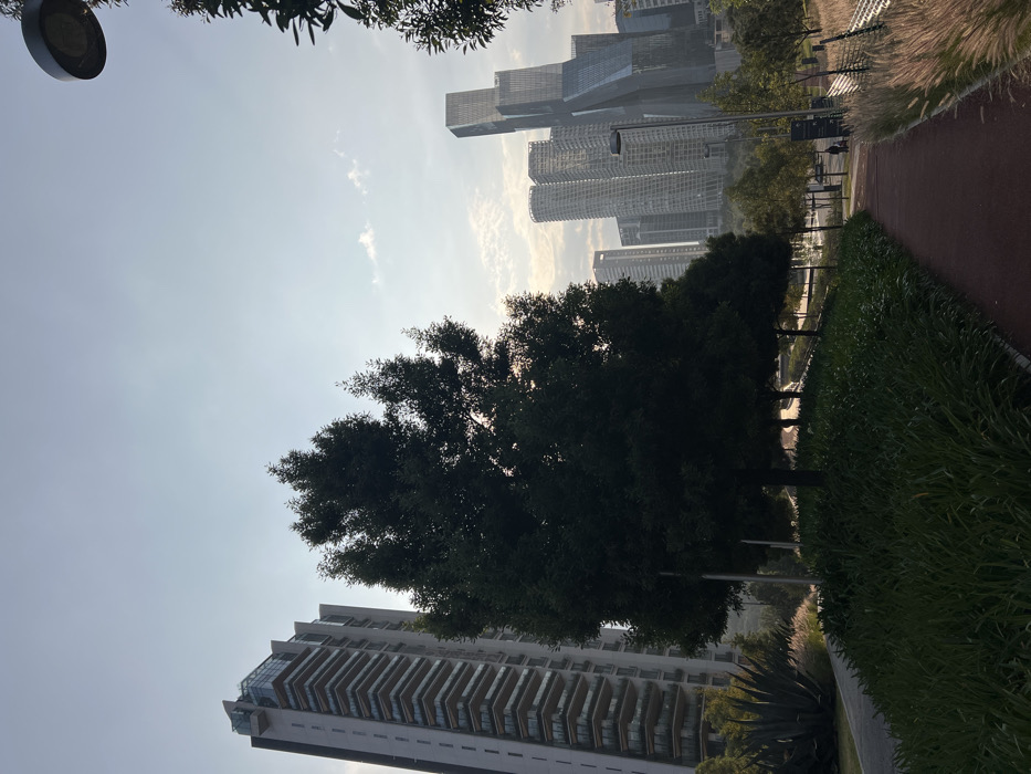 A sideways view shows tall buildings in the background under a bright sky. In the foreground, a lush green tree obscures the view of another building at the bottom. A paved pathway runs along the right side, lined with dense green grass. A black light fixture is partially visible in the upper left corner, framed by leaves.