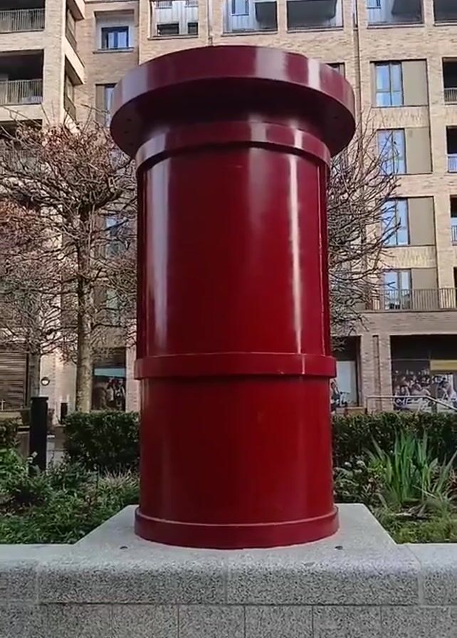 A low-angle shot presents a red, cylindrical art installation on a concrete base, set against a backdrop of modern apartment buildings