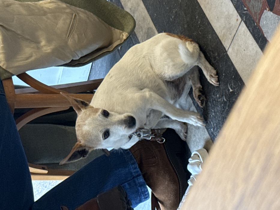 A white-furred dog with tan markings on its head, ears, and hindquarters sits on a tiled floor. The dog wears a dark collar with a metal leash clip and gazes forward. Its front paws are extended, and its back is slightly hunched. The floor features a pattern of alternating black and light-colored (likely grey or white) rectangular tiles. To the left, a person's lower leg, clad in blue jeans and a brown boot, is visible. Adjacent to the boot on the floor is a light-colored, irregularly shaped object. Behind the dog, parts of wooden chair legs are discernible, along with a beige-lined, olive-green garment hanging over a chair. A light-colored background element is visible behind the chair. A wooden surface, likely a table edge, occupies the lower foreground. The scene is set indoors in the city of Biarritz, France.