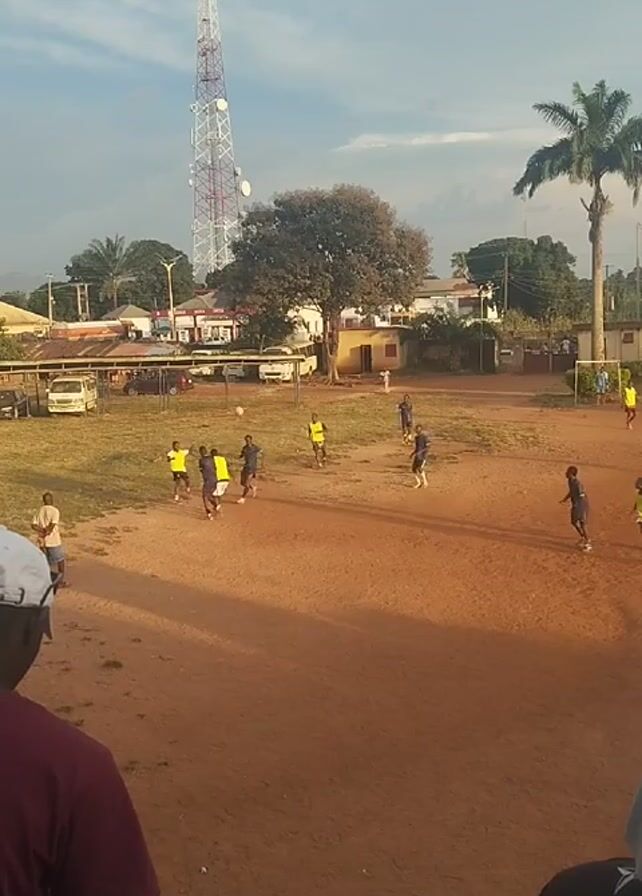 soccer match on a dirt field. Several players in dark blue and yellow vests are actively playing. A large communication tower stands in the background. A few spectators are visible in the foreground, watching the game. A palm tree is also visible on the right side of the field. The sky is slightly cloudy and the lighting suggests it is either early morning or late afternoon.