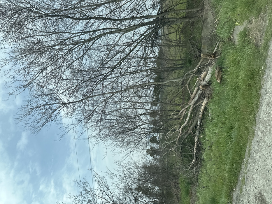 The scene depicts an outdoor rural or semi-rural landscape in Madzherito, Bulgaria. In the foreground, the lower left quadrant shows a segment of a light-colored dirt or gravel path/road. Adjacent to this path, lush green grass covers the ground extending across the lower half of the frame. In the middle ground, resting horizontally upon the green grass, is a substantial cluster of fallen tree trunks and branches, primarily light brown and gray in color, with exposed wood and bark. These logs appear to be from one or more deciduous trees. Behind the fallen logs and extending into the background, a dense line of numerous bare deciduous trees, devoid of leaves, rises vertically, their intricate branches silhouetted against the sky. Some taller, possibly evergreen trees or denser foliage are visible further in the background, particularly on the left. The sky, visible above the tree line, is partly cloudy with patches of pale blue and scattered white/light gray clouds. A single dark utility wire or power line spans horizontally across the upper left and middle portion of the sky, with a faint linear contrail visible parallel below it. No individuals, animals, or discernible human activity are present in the image.