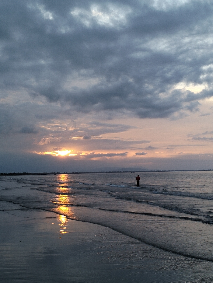The image depicts a coastal scene at a beach in Curehtunong, Indonesia, during either sunrise or sunset. The sky is largely covered by dense, dark grey clouds in the upper half, transitioning to lighter, orange-yellow hues near the horizon where the sun, partially obscured by clouds, casts a bright glow on the left. An expansive body of water, likely the sea, occupies the middle ground, reflecting a prominent, elongated vertical streak of bright yellow-orange light from the sun. Small waves are visible on the water's surface and receding onto the wet sandy foreground, forming distinct linear patterns. A single individual is present in the mid-ground, standing approximately hip-deep in the water. This person is silhouetted, facing away from the camera, and appears to be wearing dark clothing. A faint landmass with indistinct structures is visible along the distant horizon.