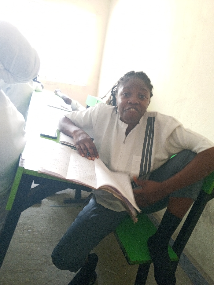 The scene is an indoor setting in Keffi, Nigeria, likely a classroom or study area