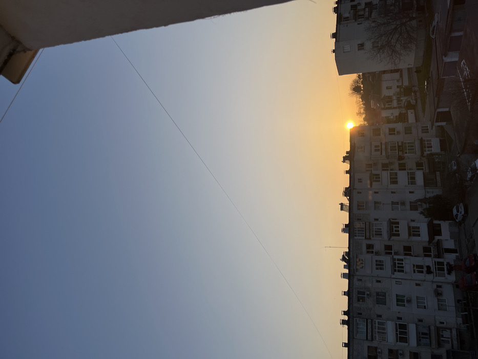 The image displays an urban residential landscape during the golden hour, likely sunrise or sunset, in the city of Unknown, Unknown, viewed from an elevated perspective. The sky occupies the upper two-thirds of the frame, transitioning from a light blue at the top to a bright orange and yellow near the horizon. The sun, a prominent orange-yellow disc, is visible low on the horizon, partially obscured by distant trees and buildings. A thin, dark wire or power line extends diagonally across the sky from the upper right quadrant towards the lower left. A section of a white building, including a gutter, is visible on the far right, suggesting the vantage point. The mid-ground features a large, multi-story apartment building constructed of light-colored concrete, characterized by numerous windows and balconies. Its roof is equipped with chimneys, vents, and several cylindrical solar water heaters. To the right of this primary structure, another similar apartment building is partially visible. The lower section of the image shows ground-level structures, possibly garages, and parked vehicles, including at least two white cars and one red car, on paved surfaces. Bare deciduous trees are scattered in the background, particularly visible near the sun. No individuals are present or engaged in any discernible actions.