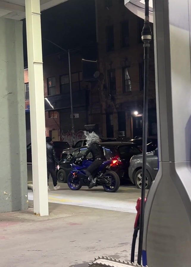 At a gas station at night, a person in black clothing and a large wolf-like costume headpiece sits on a blue motorcycle. Another person in a black jacket and white sneakers stands nearby looking at them. Several parked cars are visible in the background. The scene is dimly lit. The gas pump is in the foreground.