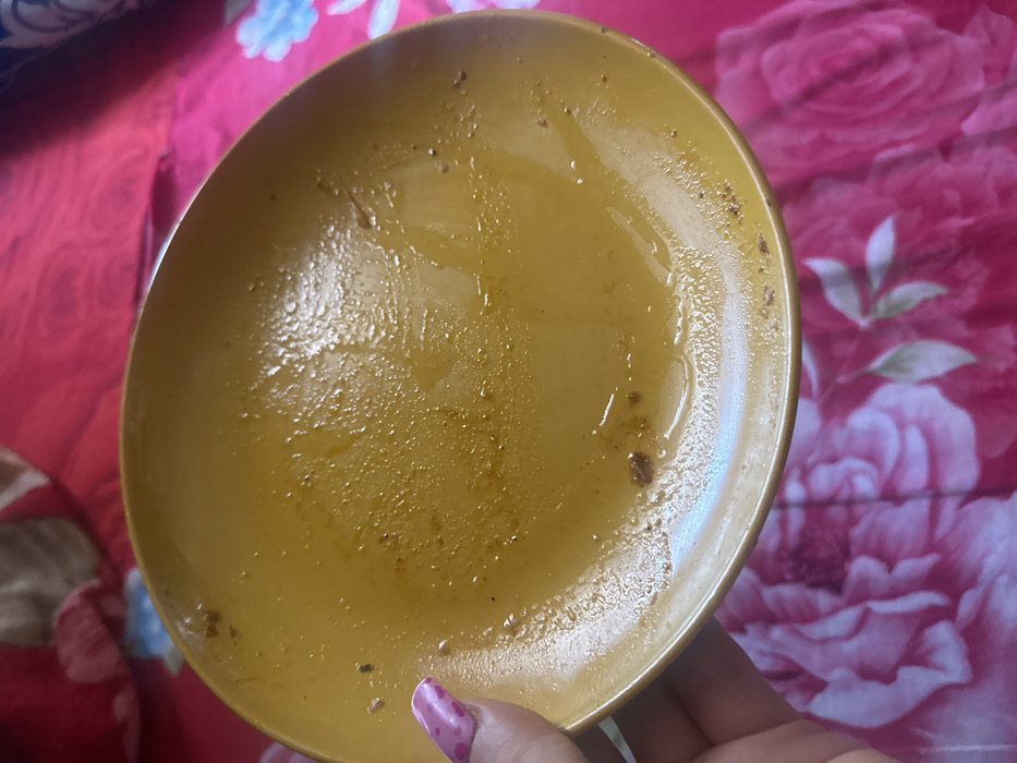 The image presents a circular, yellow plate, approximately 20-25 cm in diameter, held by a left hand in the foreground. The plate's interior surface is coated with a clear to light brown oily residue and scattered dark brown, granular food particles, consistent with a recently consumed meal. The visible fingernails of the hand holding the plate are painted pink, featuring small white circular patterns. The background, out of focus, consists of a textile displaying a pattern of large pink roses with green foliage on a deep pink fabric, indicative of a bedspread or similar soft furnishing. The scene appears to be an indoor, domestic setting. The specific city of Ado, Nigeria, cannot be visually confirmed from the details within the image.