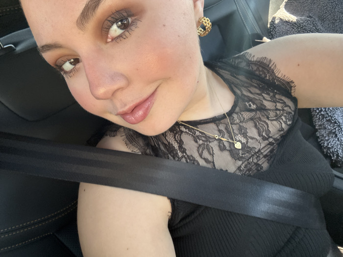 A woman takes a selfie in a car, wearing a black low-cut top with a lace overlay and a gold chain necklace with a small pendant. She has gold hoop earrings and is wearing a seatbelt. The woman has brown eyes and well-groomed eyebrows, and her makeup includes blush and lip gloss. The background shows the interior of the car.
