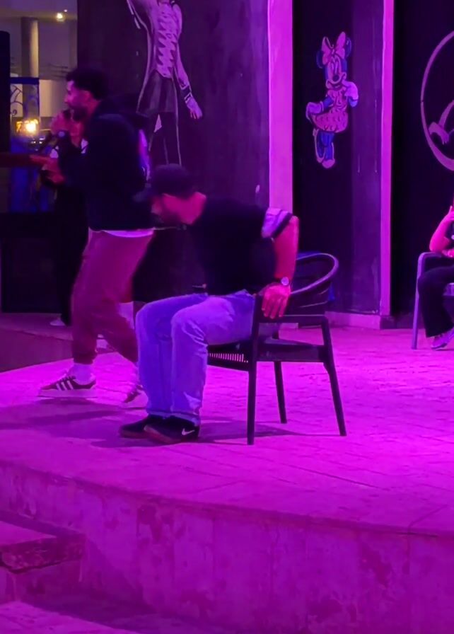 A group of people are gathered on a raised stage under purple lighting. A man in light blue jeans and a black shirt, seated in a black chair, claps along with the music. Another man in a black hoodie and maroon pants is holding a microphone and rapping. Behind them, a woman in a white and black outfit dances, and two other men stand. The backdrop features painted figures on a black wall. The setting appears to be an outdoor venue, possibly a resort or club.