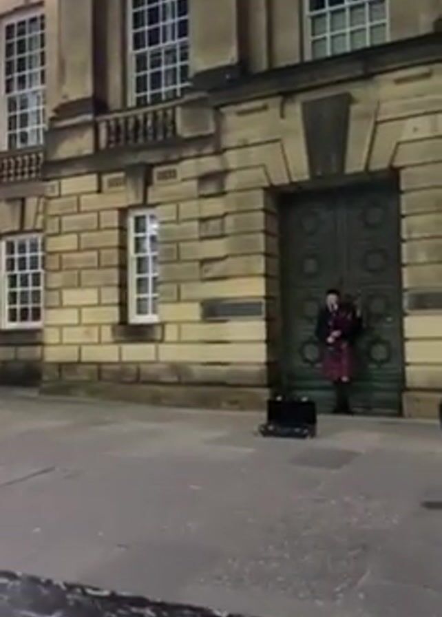 bagpiper playing in front of a stone building at night. The bagpiper, dressed in traditional Scottish attire, stands near a large, ornate door with a closed black bagpipe case on the ground nearby. Several people walk past the bagpiper on the sidewalk. The building has several large windows with multiple panes. The scene is lit by streetlights.