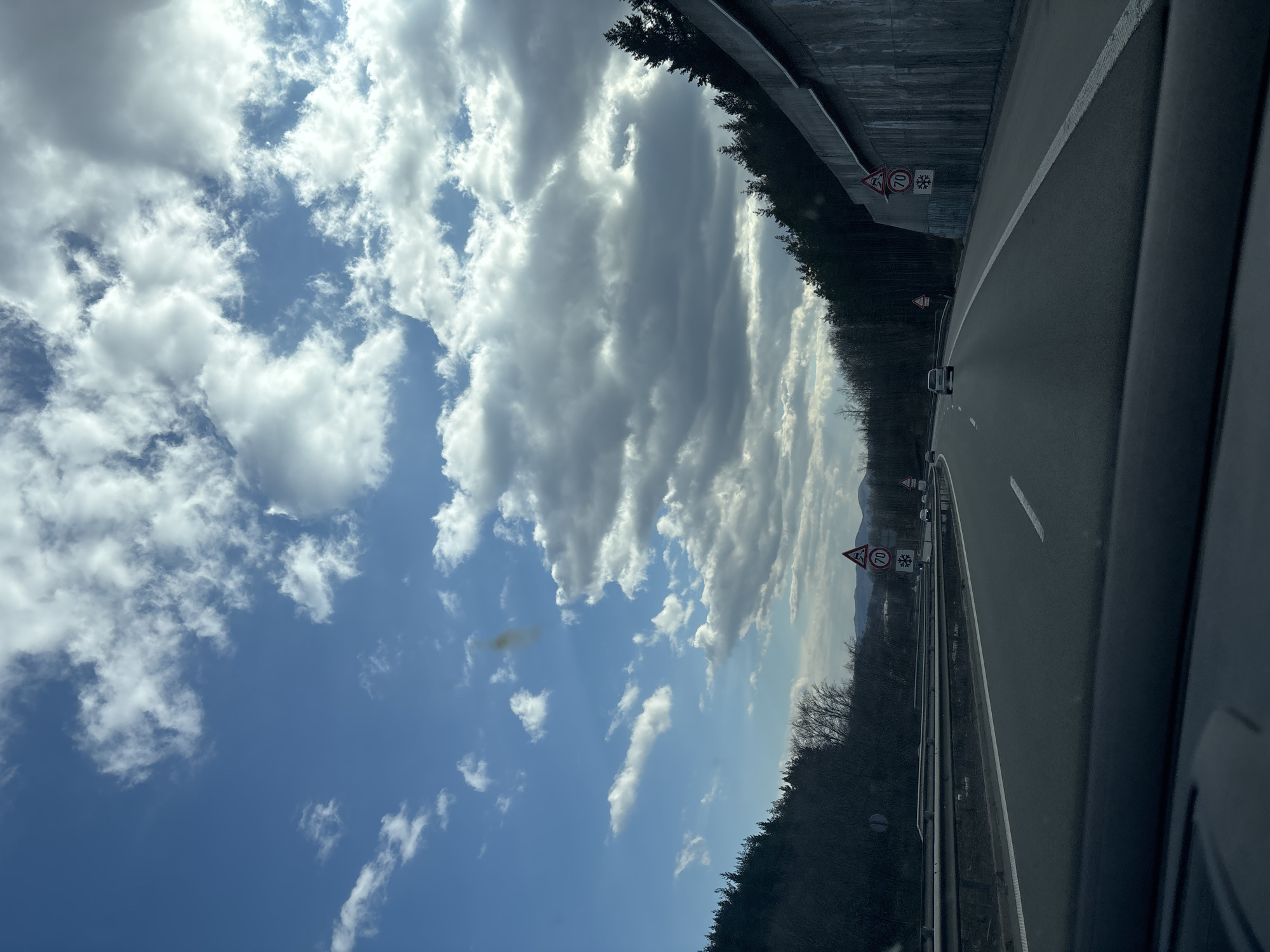 The image depicts a multi-lane asphalt highway in Golemo Buchino, Bulgaria, viewed from inside a vehicle through its windshield, with a portion of the dashboard visible at the bottom. The highway features at least two lanes in the direction of travel, separated by white lane markings. A light-colored passenger vehicle is visible in the right lane further ahead, with other vehicles in the distance. On the left side, a metal guardrail separates the lanes from a sloped terrain densely covered with bare deciduous trees and some evergreen foliage. In the far background, distant hills or mountains are discernible under a horizon line. On the right side, a tall, grey concrete retaining wall runs parallel to the highway, topped by a dense forest primarily composed of evergreen trees. Several road signs are present: On the left, a triangular warning sign for "other dangers" is stacked above a circular "70" km/h speed limit sign. On the right concrete wall, an identical "other dangers" warning sign is positioned above another "70" km/h speed limit sign, which itself is above a square blue sign featuring a white snowflake symbol, indicating potential icy road conditions. The sky above is partly cloudy, displaying patches of clear blue sky interspersed with white cumulus clouds, with some darker, heavier clouds accumulating on the right side. A faint, dark vertical streak is visible in the upper left portion of the sky. The overall lighting suggests daytime conditions.
