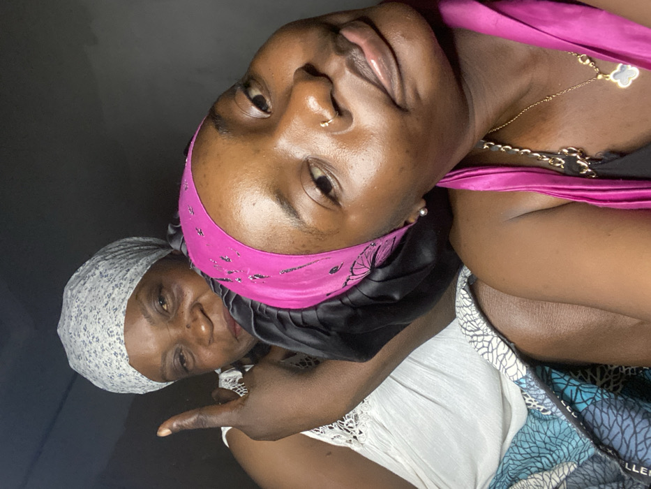 Two dark-skinned women are in the frame. The younger woman wears a pink headscarf with black underneath and a small nose ring. She also has a gold necklace. The older woman wears a white floral head covering and white top. She is pointing with her right index finger. The background appears dark.