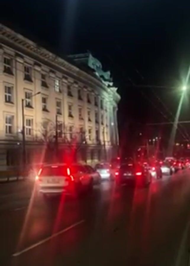 nighttime street scene with a long, light-colored building on the left. It has multiple windows and some statues on the roof. Traffic is moving slowly on the right side of the street. A line of cars with red brake lights visible stretches into the distance. Streetlights illuminate the scene. A pedestrian walks on the sidewalk.